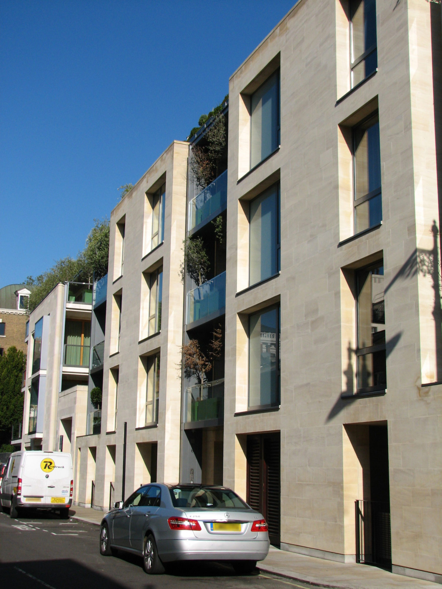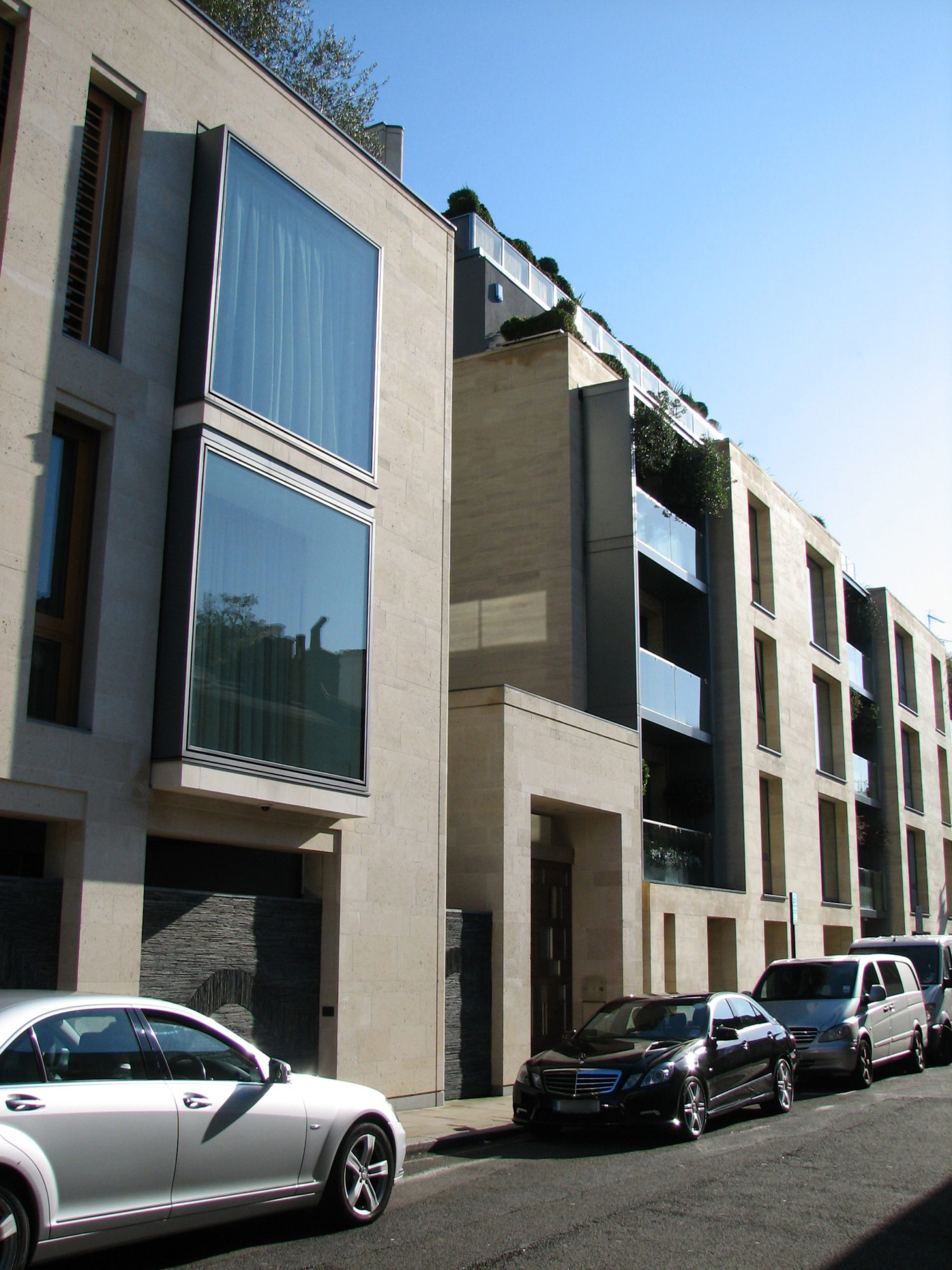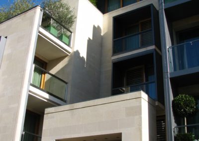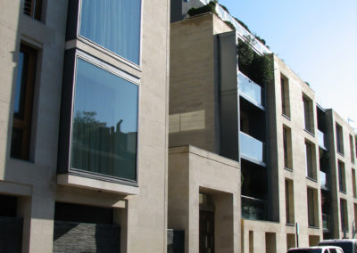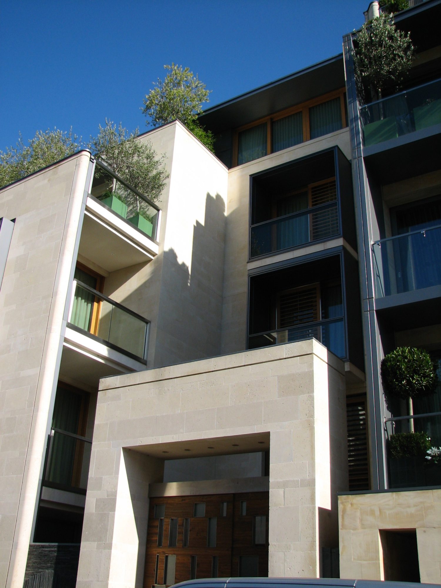 MONTROSE PLACE – London / UK – 2006 Modern apartment complex, limestone cladded external walls Stone contractor – Szerelmey Ltd Saint Maximin Roche France limestone Stainless steel fixings Designer of stone cladding of entrance gate and 4 chimneys and their fixings Altogether 80 sqm in my scope of work