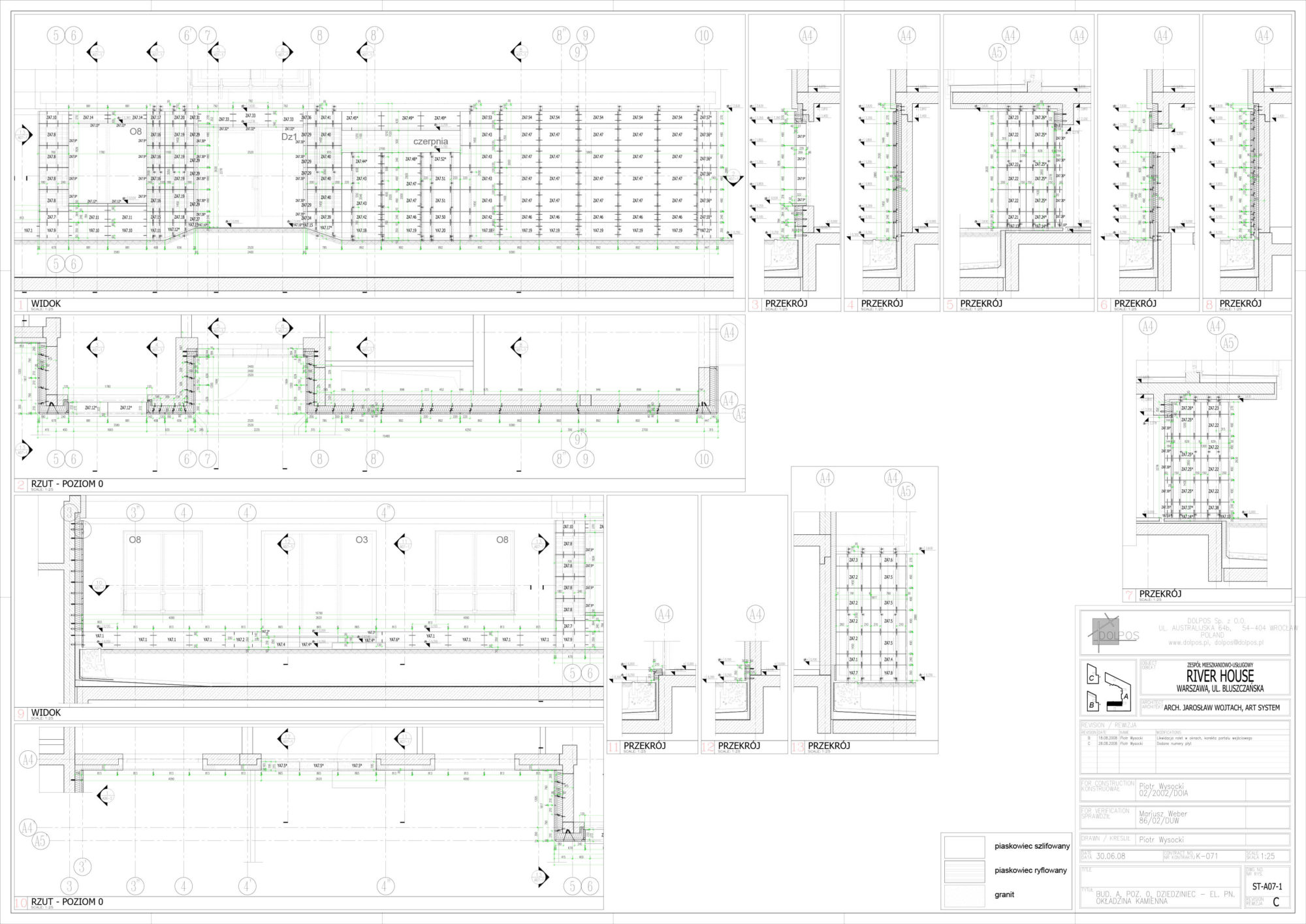 RIVER HOUSE APARTMENTS – Warsaw / Poland – 2008 Complex of three housing buildings – exterior façades stone cladded up to second floor level 1100 sqm of Zbylutow sandstone and Yellow Rusty granite used for plinth bespoke sub-structure and fixings Stone contractor: Dolpos My scope: Designer of stone cladding, its sub-structure and fixings